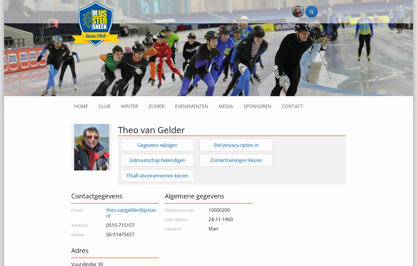 Op de persoonlijke ledenpagina vind je je eigen contactgegevens, eventuele pasfoto, bondsnummer en facturen. Bovenaan staat het menu met knoppen om je gegevens te wijzigen, je privacy-instellingen aan te passen, je lidmaatschap te beheren en abonnementen voor de zomer/wintertrainingen te bestellen: